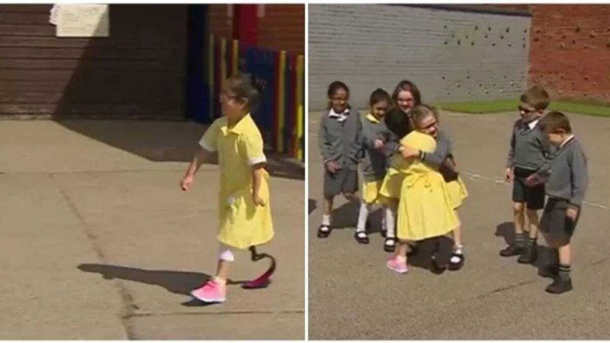 - Seven-year-old girl is mobbed by her friends after she acquires new leg