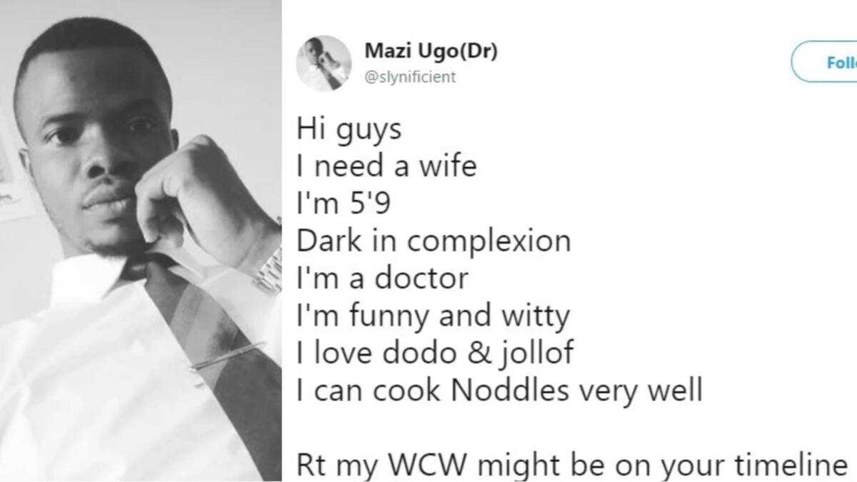 Sharing a photo of himself, he wrote: "Hi guys. I need a wife. I'm 5'9. Dark in complexion. I'm a doctor. I'm funny and witty. I love dodo & jollof. I can cook Noddles very well. Rt my WCW might be on your timeline