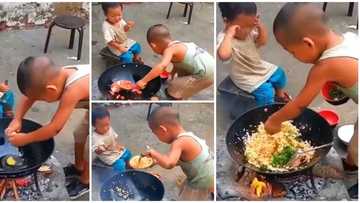 Little boy cooks 'rice' over wood fire, dishes to his younger one in sweet clip, many praise his cooking skill