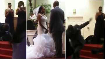 Massive reactions as groom falls under anointing after kissing bride on the altar, jumps up in viral video