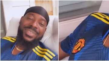 I hate that I love you: Adekunle Gold stirs reactions as he wears Man Utd jersey despite UCL disqualification