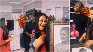 Yul Edochie's wife May blushes hard in video as man travels all the way from Enugu to gift her lovely artwork