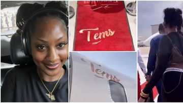 "Take it easy girl": Fans beg as Tems flaunts her curvy figure, hops on customized private jet in video