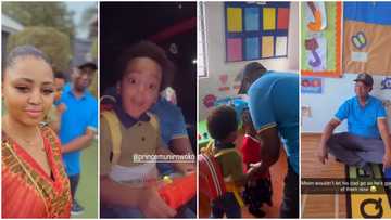 Cute videos as Regina Daniels’ son says he’s happy to go to school but refuses to let dad leave him in class