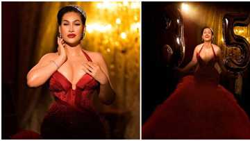 In a photo shared via her Instagram page, the gorgeous lady posed in a red 'George' wrapper with an off-shoulder corset top.