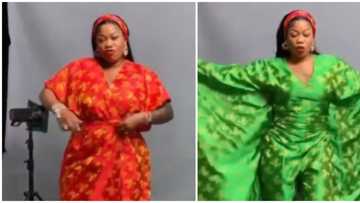 In the video, she is seen striking poses in a red print robe dress. However, when she removes the belt and makes an attempt to strip, it falls open giving way to a green look which appeared to have been lined against the red fabric.