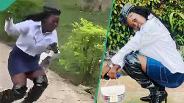 Final-year student gets netizens laughing after falling with her high boots: "She don go buy okrika"