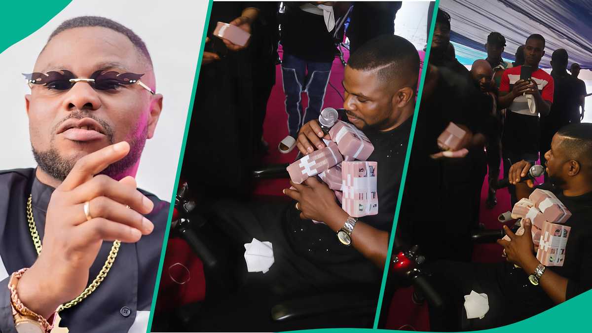 - The singer’s hands were filled with bundles of naira as he struggled to keep them from falling, while the man stood in front of him, ready to spray even more