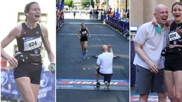Oyinbo man proposes to partner on the finishing line of marathon race, moves her to tears in video