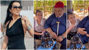 'Oyinbo' lady kneels for veteran actor Pete Edochie in sweet video as he teaches her Igbo language