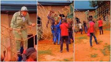 Funny moment 'corper' got stuck inside net during camp's exercise, men rush to carry her in video