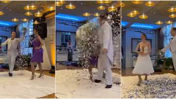 No be juju be that? Lady in purple gown transforms into white dress as silver particles rain on her in video