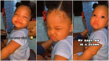 She don wise finish: Reactions as baby girl winks in viral video, makes family members laugh