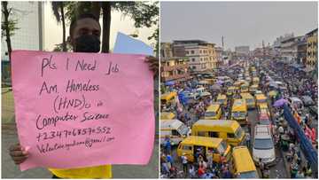 He should do business: Reactions as frustrated Nigerian man hits Lagos street with placard, begs for job