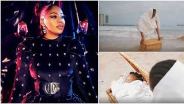 Toyin Lawani places daughter in a basket by seaside, fights like Jackie Chan in music video for 40th birthday