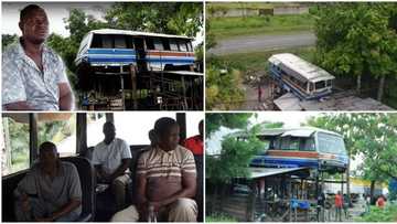 Man buys an old bus, hangs it on top of house & converts it into restaurant, people seen eating fufu in video
