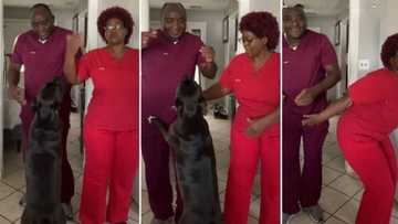 Couple shows off accurate dance during work shift, dog joins them and refuses to leave stage, video causes stir