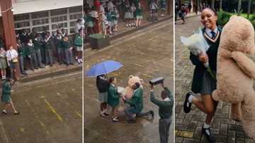 “This Girl Too Fine”: Secondary School Boy Proposes to Pretty Girl in Front of Entire School With Teddy Bear