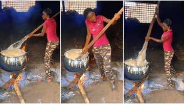 "I will be rich till I die": Slim lady in army camo turns plenty fufu for sale in large pot, video goes viral