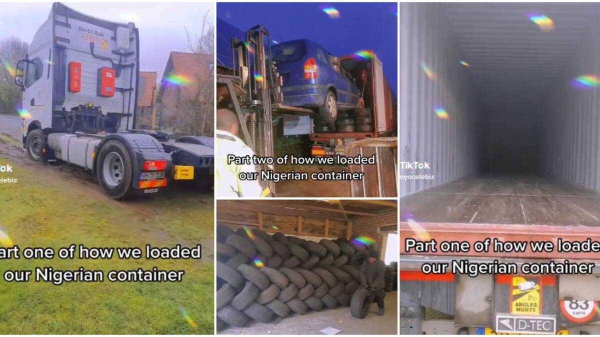A Nigerian lady abroad, Blessing Ifeoma, caused a stir online as she showed how 3,400 tyres and a car were packaged into a container that is Nigeria bound.