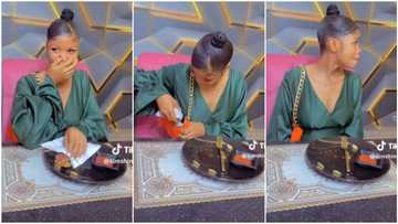 "I no fit leave am": Shy Nigerian lady looks around before packing her leftover chicken inside restaurant