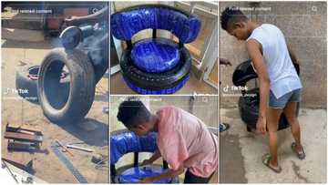 Young lady recycles old car tyre into beautiful furniture, puts cushion, her video amazes many