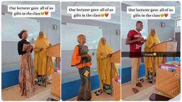 Female lecturer surprises students with gift in class, they walk to the podium excitedly in video