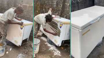 "I charge only N15,000": Talented lady who transforms old fridge into new one with fine paint trends
