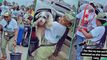 Female corper welcomed by her man and dog in grand style after leaving NYSC orientation camp