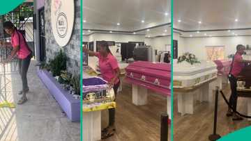Young lady who owns funeral home shows how she cleans her office, video captures various coffins