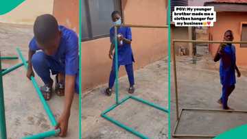 Talented Nigerian boy makes beautiful clothes hanger with pipes, his sister uses it for business