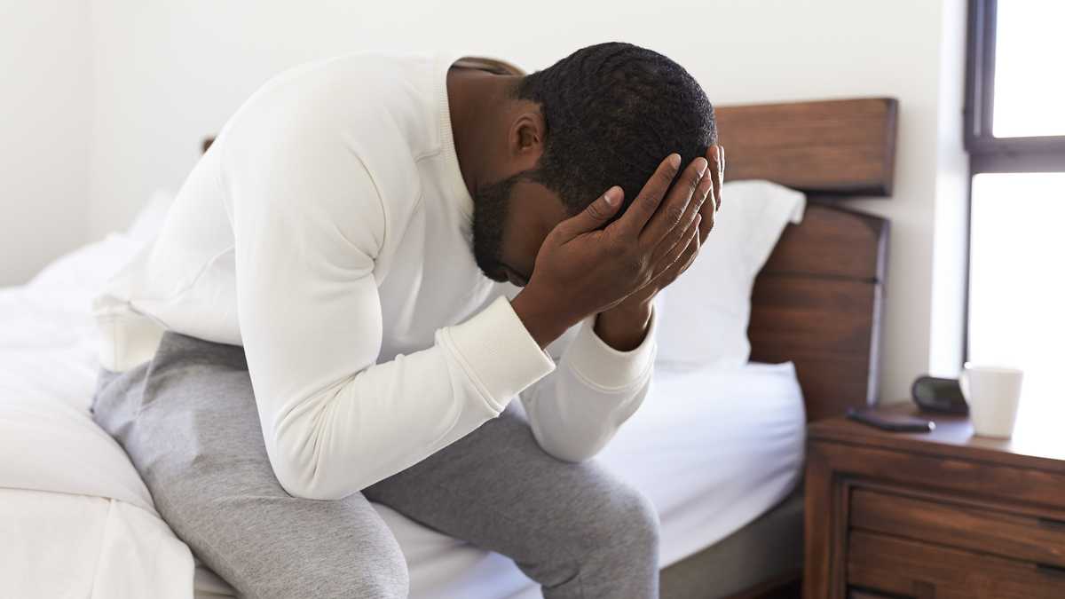 He sat down on the edge of the bed, his head in his hands.