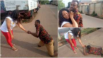 Nigerian comedian gets a 'yes' as he fully prostrates on the road to propose to lover, says love is sweet