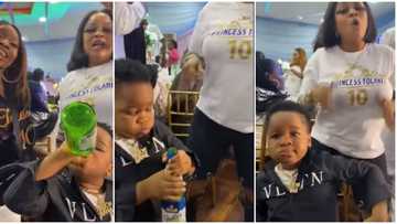 Little boy with '30 BG' chain on his neck drinks beer at event, dances with ladies, video stuns many