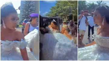 Drama on wedding day as bride's luxury ball dress 'refuses' to enter the car in video, Nigerians react