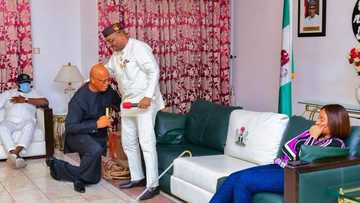 Umo Eno, a commissioner in Akwa Ibom state, was spotted in a viral photo kneeling before the state governor.
